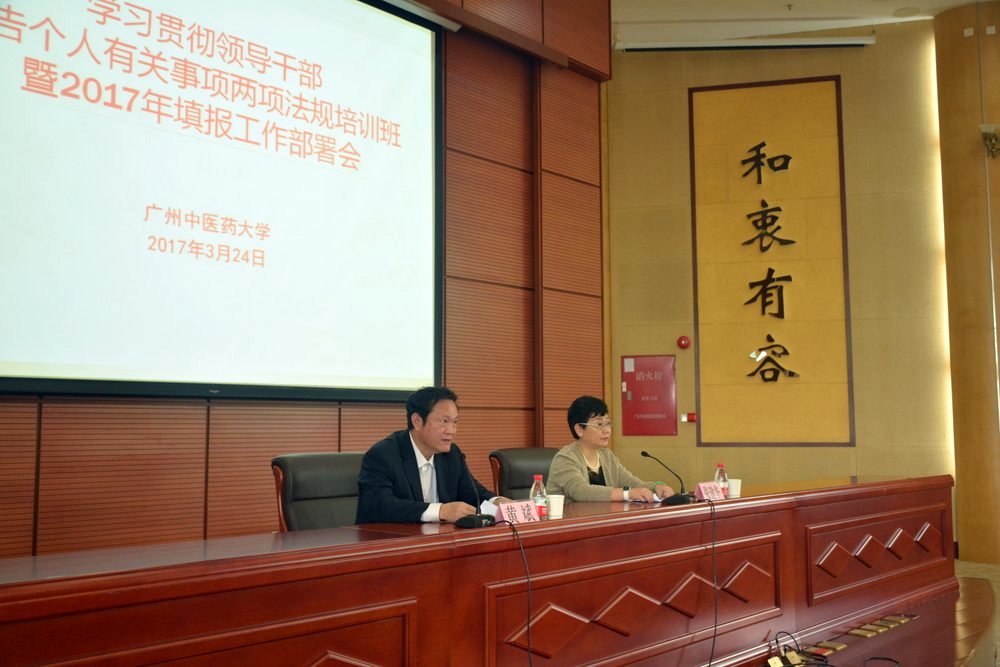 3月24日上午,学校党委在大学城校区学术报告厅召开领导干部报告个人有关事项两项法规培训暨2017年填报工作部署会,学校党委书记黄斌主持会议。