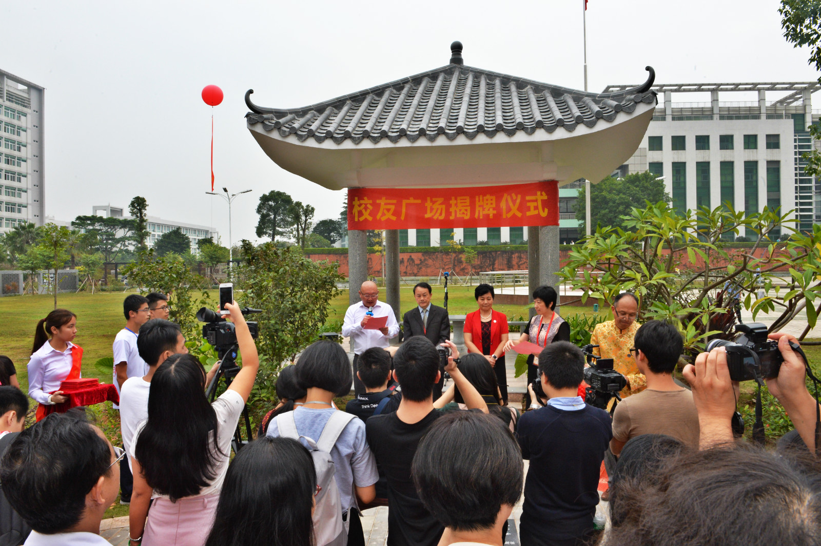 校园里,彩旗飘扬,龙狮起舞,校友齐聚,欢声笑语。