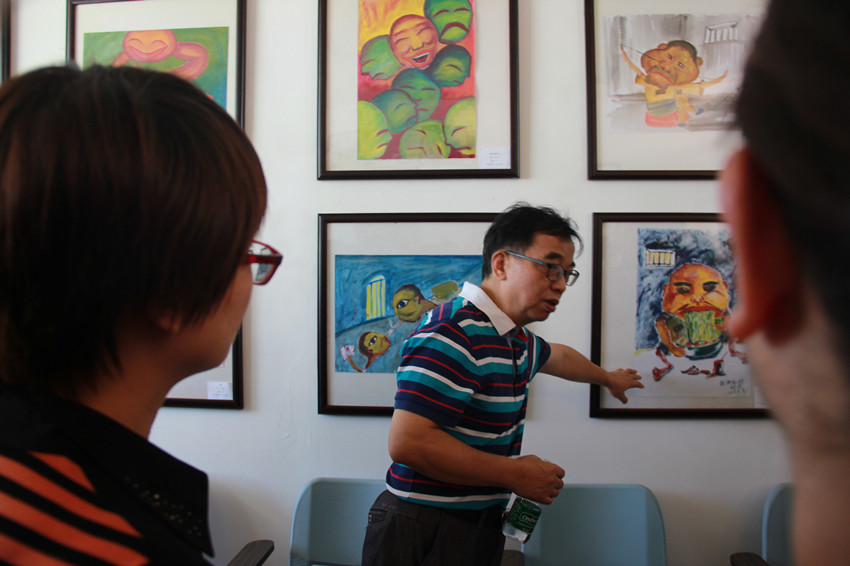 邱鸿钟教授带领出席领导和嘉宾参观了原生艺术与心理漫画作品,并作出详细介绍。各参展作品吸引了参观人员的兴趣,纷纷拍照留念并对作品内容进行探讨。据悉,上百幅来自省内精神病医院精神障碍患者的画作以及大学生原创心理漫画将在经管楼5楼进行为期两个月的展示。