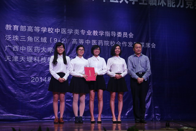 11月28-29日,在广西南宁举行的"天堰杯"第二届泛珠三角区域中医大学生临床能力竞赛上,我校2010级4名同学组成的代表队,凭借扎实的中医基础理论知识功底和娴熟的临床操作技术荣获大赛团体一等奖,第一临床医学院中西医临床医学专业黄秀芳同学同时斩获中医学基本理论知识考核、舌诊与脉诊技能竞赛和针灸技能竞赛3项一等奖。来自广东、福建、云南、贵州、四川、江西、湖南、海南、广西等地的中医院校及相关专业高等院校和香港中文大学、香港浸会大学、澳门科技大学等15所院校的师生代表参加了比赛。