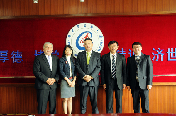 许能贵向来宾介绍了我校历史沿革、发展现状及对外交流与合作和国际化办学等方面情况。许能贵表示,对外教育工作是推进中医药高等教育国际化的重要途径,我校正致力于扩大对外教育规模、提高教育层次并着力保证培养质量。我校与拉丁美洲中医学院长期友好合作关系为拓展智利和我校的合作空间提供了良好基础,相信龙啸天总领事本次到访将为智利与我校国际化人才培养、卫生合作发展提供良好契机。龙啸天对我校近年来在医疗、教育和基础建设等方面所取得的成绩给予高度赞赏,并表达了希望在2015年中智建交45周年之际,与我校合作举办系列活动,以促进双方在中医药教育、研究和临床合作项目等领域互助合作意愿。