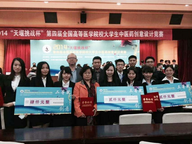 2014年11月1日,第四届"天堰挑战杯"全国高等医学院校大学生中医药创意设计竞赛决赛在天津中医药大学举行。我校第一临床医学院学生赵丽娴团队的作品《中医药文化与3D压花工艺》获得大赛空间类二等奖(指导老师:陈国菊、陈文桂);第二临床医学院学生黄俊廷团队的作品《国医圣手出诊游戏学习软件》(指导老师:钟天送)和谢宛君团队的作品《手机APP应用类中医养生文化传播载体的设计与实现》(指导老师:刘焕兰)获得大赛新媒体类三等奖。同时,我校还获得大赛"优秀组织奖",成为五个获奖中医药高校之一。