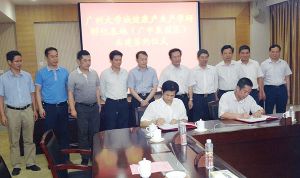 4月29日下午,我校与番禺区政府属下企业广州大学城健康产业科技园投资管理有限公司(以下简称"健康产业公司)合作共建广州大学城健康产业产学研孵化基地(广中医园区)的签约仪式在大学城管委会举行。
