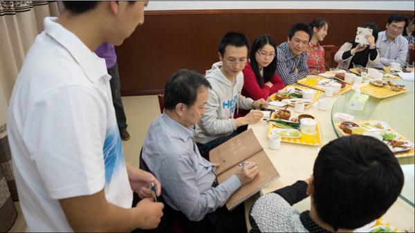 席间,王校长还解答了同学们在住院医师规范化培训政策方面的疑惑、交流了中医药教育和全科医学教育的想法、回应了饭堂物业和岭南名医壁维护等后勤保障问题,分析了保研问题,还为同学们推荐阅读书籍《乔布斯传》。在晚餐论坛的尾声,深圳临床医学院2012级的袁长健同学代表学院同学邀请校长在学院纪念册上签名,王校长欣然答应。首期校长晚餐论坛经过两个小时的畅所欲言和深入交流后,在同学们与校长的合影的欢声笑语中落下帷幕。