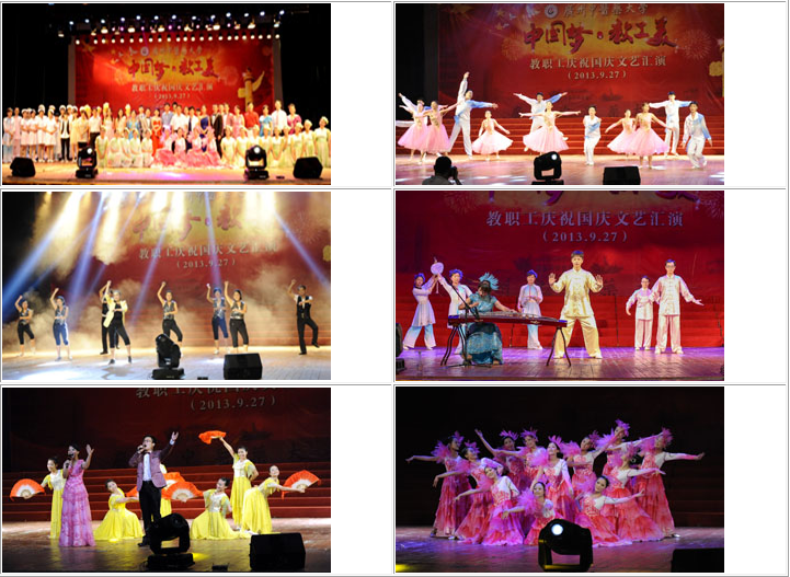 9月27日下午,"中国梦·教工美"2013年教职工庆祝国庆文艺汇演在大学城校区大礼堂举行,16个二级工会共奉献了18个精彩的节目。党委书记黄斌、副书记张建华、副校长刘晟与教职工一起观看演出并与演员合影留念。 全场分为"祖国颂"、"教工美"、"中医魂"、"梦飞翔"四个篇章,汇演节目主题鲜明,昂扬向上,多数为教职工原创作品,演出水平较高。此次汇演是我校为引导广大教职工从发展的视角理解"中国梦"而开展的活动,各二级工会精心组织,教职工广泛参与,展示了我校教职工良好的艺术风采和精神风貌。