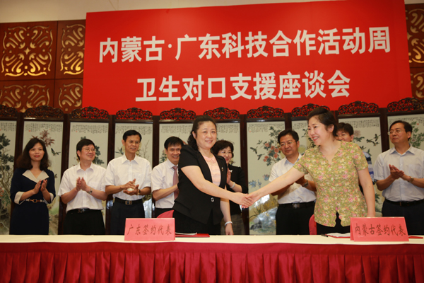 26日,内蒙古•广东科技合作活动周卫生对口支援座谈会举行,两省区卫生、中蒙医系统有关单位的30余人参加了座谈会。内蒙古国际蒙医医院、内蒙古中医医院签约成为我校非直属附属医院和第二附属医院对口支援医院,内蒙古大唐药业有限公司与我校签订蒙中药科研研发、人才培养、信息交流三方合作协议。