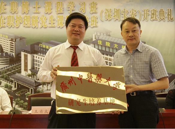5月8日上午,王省良校长、郭姣副校长带队赴我校附属深圳宝安中医院举行"beat365官方网站在职博士课程学习班暨在职护理研究生课程进修班(深圳宝安班)"开班典礼,并进行研究生培养基地挂牌仪式。深圳市卫人委廖利平处长、宝安区卫生局廖欣副局长,我校相关部门负责人到场。