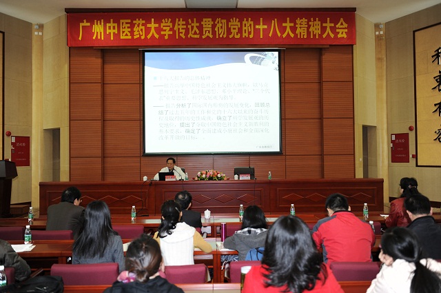 黄斌书记在总结讲话中指出,罗厅长的报告主题鲜明,内容丰富,重点突出,有很强的指导性和针对性。我们要认真落实罗厅长报告中提出的要求,把学习贯彻十八大精神作为推动科学发展,建设幸福校园的强大动力。十八大报告对教育、医疗卫生、中医药事业发展提出了更新更高的要求,我们要学以致用、用以促学,认真实施创先强校工程,以协同创新为引领,全面提高高等教育质量。当前,全校上下要全力以赴,攻坚克难,把两项重要而紧迫的任务即"211工程"三期建设验收和中医学专业认证工作做得更好。