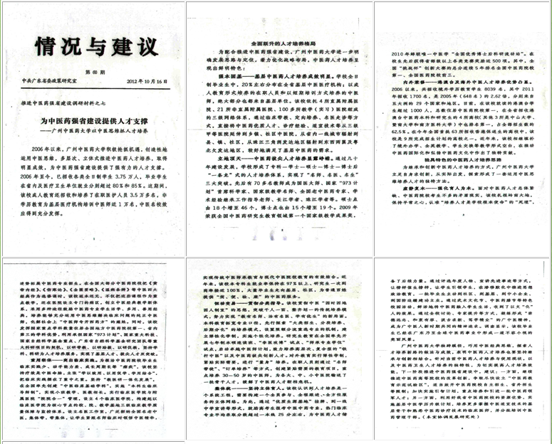 10月16日,我校人才培养工作调研报告载入省委政策研究室编印的《情况与建议》第60期,呈送省委、省政府、省人大、省政协负责人,中央政策研究室综合局及省内有关部、厅、局参阅。这是我校人才培养工作再次得到肯定。 该报告题为《为中医药强省建设提供人才支撑——beat365官方网站以中医思维抓人才培养》,从基层中医药人才培养、中医药拔尖人才培养、港澳台及海外中医药人才培养三个方面介绍了我校人才培养工作的成效,分"虚静复本"、"重用轻体"、"恒动变易"、"整体统一"四个部分总结了我校运用中医思维抓人才培养的做法。