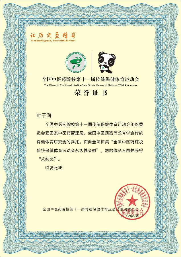 日前,全国中医药院校第十一届传统保健体育运动会在成都中医药大学落下帷幕。赛前,我校选送的经济与管理学院2011级国际经济与贸易专业的叶子润同学设计的会徽作品,从全国26所中医药院校选送作品中脱颖而出,最终获得唯一"采纳奖",成为全国中医药院校传统保健体育运动会永久性会徽。叶子润同学因此获得组委会颁发的1万元奖金。