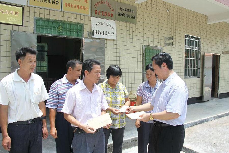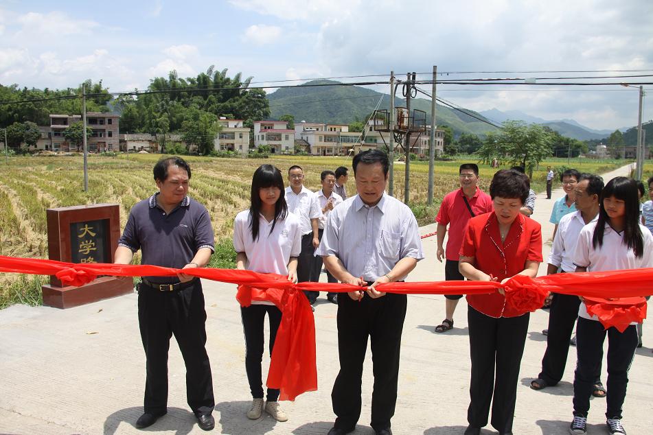 7月11日,党委书记黄斌率队前往我校扶贫开发"规划到户责任到人"对口帮扶村---河源市连平县隆街镇贵岭村,针对"扶贫双到"工作开展调研慰问活动,同时为我校资助援建的村道——"大学路"顺利完工并投入使用剪彩。