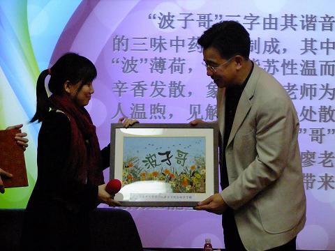论坛结束后,廖厅长收到一份由同学们赠送的别出心裁的礼物,一幅用中药压花制成的写着"波子哥"三个字的牌匾。