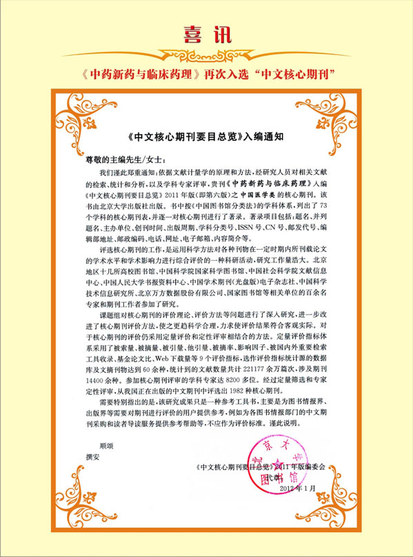 接《中文核心期刊要目总览》2011年版编委会通知:《中药新药与临床药理》杂志入编《中文核心期刊要目总览》2011年版(即第六版)中国医学类核心期刊。这是继2008年《中药新药与临床药理》杂志入编《中文核心期刊要目总览》以来,再次取得的可喜成绩。