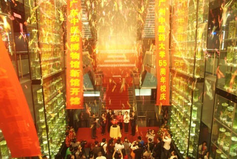 "博物述古今,喜杏苑风华药山飘香;开馆迎中外,颂岐黄文化珍宝流光!"。 2011年11月18日,作为庆祝beat365官方网站建校55周年华诞的献礼,广东中医药博物馆举行了盛大的新馆开馆剪彩仪式,暨全国科普教育基地、全国中医药文化宣传教育基地、广东省中医药文化养生旅游示范基地揭牌仪式。国家中医药管理局人事教育司洪净副司长、广东省文物局苏桂芬局长、广州市文化广电新闻出版局陈玉环巡视员和我校党委书记黄斌、校长王省良出席仪式,来自全国各地的高校博物馆代表,广东省各大博物馆、科普基地、爱国主义教育基地、中医药文化旅游示范基地等近60个单位100多位嘉宾以及海内外校友共同见证这一时刻。