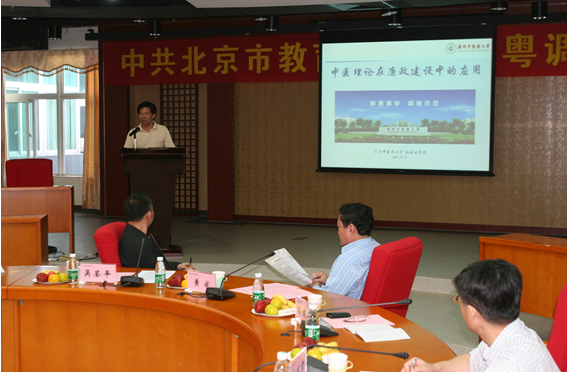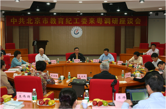 11月15日上午,北京教育纪检监察工作研究会第一片组高校一行22人,在北京市教育纪工委郑立波副书记的带领下,会同广东省教育纪工委、广州地区10所高校纪检监察工作负责人,齐聚我校大学城校区办公楼1-01会议室,召开北京市教育纪工委来粤调研座谈会。会议由广东省教育纪工委吴鉴平处长主持。 学校党委黄斌书记在会上致欢迎辞并简要介绍我校纪检监察工作情况,孙晓生副书记作题为《中医理论在廉政建设中的应用》的主题发言。与会各高校代表就调研主题"高校如何开展廉政风险防控、规范权力运行、校检合作预防高校职务犯罪、校园廉政文化建设"等工作,展开了热烈的探讨和交流。