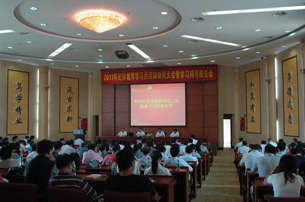 黄斌书记在动员报告中指出,开展纪律教育学习月活动对于加强党风廉政建设和反腐败斗争,扎实推进校园廉政文化建设,促进学校和谐稳定和科学发展有着十分重要的意义。黄书记强调,全体党员干部和师生员工要围绕今年活动主题"以人为本,执教为民",有针对性地开展纪律教育学习活动,扎实开展反腐倡廉宣传教育工作,推动学校党风廉政建设。他要求各单位、各部门要按照学校统一安排和要求,进一步统一思想,提高认识,增强自觉性和责任感,通过加强组织领导、创新形式方法、讲求质量效果,积极构建教育、制度、监督并重的惩治和预防腐败体系,促进学校科学发展,建设幸福校园。