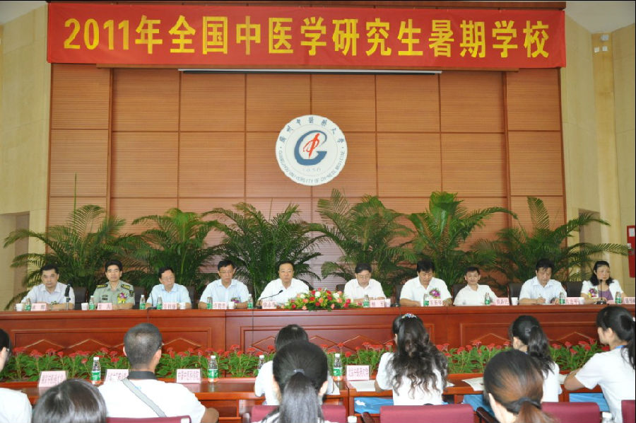 8月26日上午,由教育部和国家自然科学基金委员批准和资助,我校承办的2011年全国中医学研究生暑期学校开学典礼在学校大学城校区举行。广东省学位委员会办公室杨军主任、校长徐志伟教授、副校长王新华教授、许能贵教授、省内外知名中医药专家以及学校相关职能部门、研究生院和各二级单位领导出席了典礼。来自全国21所医药高等院校相关学科的260余名学员参加了开学典礼。