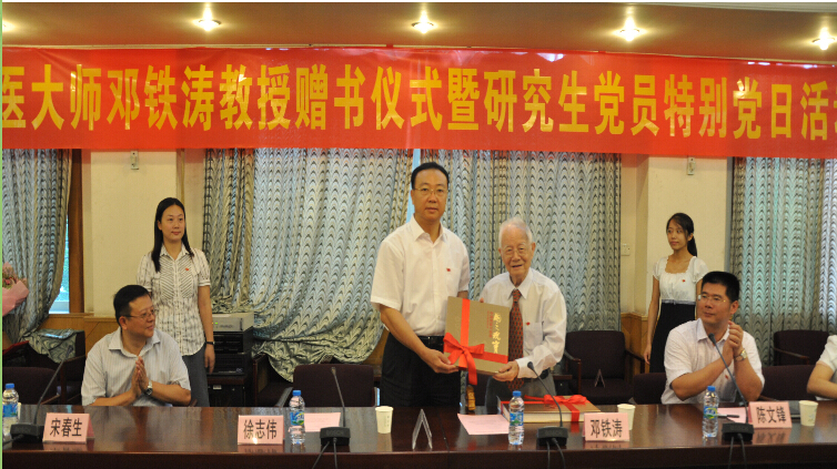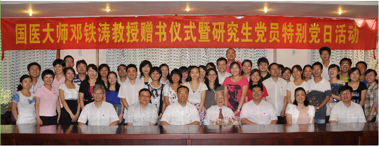 国医大师、学校终身教授邓铁涛满怀对党的浓厚感情,以自己的亲身革命经历为研究生上了一堂生动的党课,震撼了研究生党员的心灵。邓老认为,中国共产党不仅坚持马列主义思想的指导,更凝聚中华文化的精髓、发展中医药,鼓励中医学子坚定对党的信念、对中医的信念。他勉励学生们要增强振兴中医的使命感和责任感,秉承"医者仁心"的信念济世救人;希冀研究生党员努力学好本领,造福人民,为世界人民做贡献。听完邓老语重心长的教诲,研究生党员们激情昂扬,对"大医精诚"有了更加深刻的理解。活动期间,邓老向学校捐赠图书(《文澜铁涛——邓铁涛教授报道集锦》、《国之瑰宝——中国国医大师录》),作为献给中国共产党党成立90周年的礼物。研究生党员近距离目睹大师风范,聆听大师教诲,深受启发和教育。