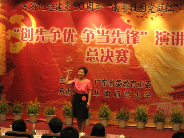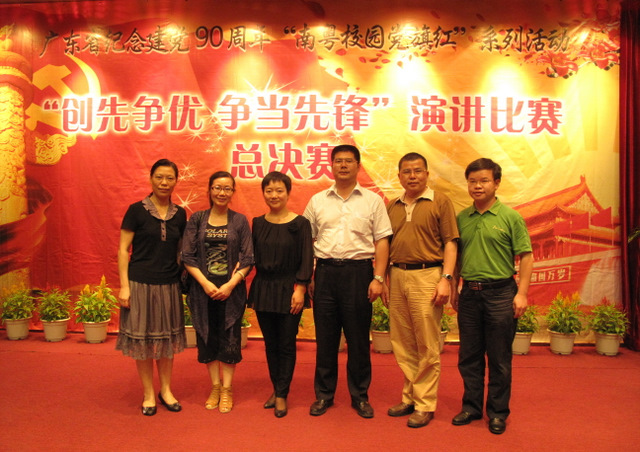 5月31日晚,由广东省委教育工委主办的广东省纪念建党90周年"南粤校园党旗红"系列活动之"创先争优,争当先锋"演讲总决赛在华南师范大学落下帷幕。我校护理学院杨筱多老师获得了教工组二等奖,人文社科学院李许同学获得学生组优秀奖。