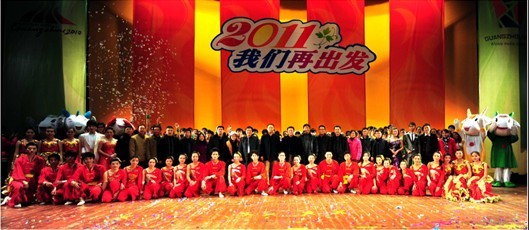 晚会开始,黄斌书记代表学校党政领导作了新年致辞,向为我校各项事业的建设和发展付出心血和汗水的学校师生员工及服务亚运会、亚残运会的广大志愿者表示衷心的感谢,并致以诚挚的问候和新年的祝福!进入2011年,黄斌书记希望同学们不要辜负党和人民的期望,刻苦学习,努力实践,不断提高综合素质,争取早日成才。