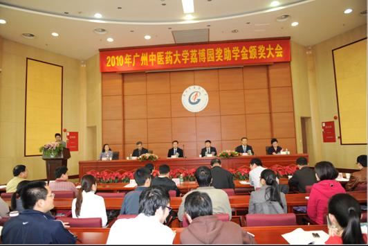 12月20日,我校举行2010年荔博园研究生奖助学金颁奖大会。国家中医药管理局吴刚副局长、国家中医药管理局机关事务局孙涛局长、北京荔博园医药研究所黄银发总经理等领导嘉宾一行5人亲临我校出席颁奖大会。学校党委书记黄斌教授、校长徐志伟教授出席,研究生院与各二级学院主管领导、管理干部、获奖学生等180人参加了颁奖大会。