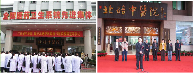 4月7日,广东省中医院协作医院挂牌签字仪式在重庆市北碚区中医院举行,学校副校长、第二临床医学院(广东省中医院)党委书记、院长吕玉波带队,二院党委副书记、副院长陈达灿、大脑病科主任黄燕、科研处处长唐雪春、学生处处长郑永臻、医教处副处长韩丽琳、治未病中心主任林嬿钊出席了仪式,重庆市卫生局副局长方明金、北碚区委常委、纪委书记傅在鹰、区人大副主任韩燕、区政协副主席卢兆林、区卫生局党工委书记廖本明、区卫生局副局长汪力华参加了仪式,挂牌签字仪式由北碚区副区长王大勇主持。吕玉波院长与北碚区中医院党委书记、院长尹平签署了协作医院协议书,并授牌"广东省中医院协作医院"。仪式在热烈的气氛中完成。
