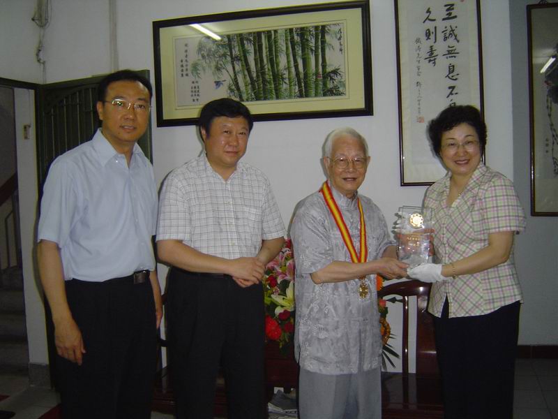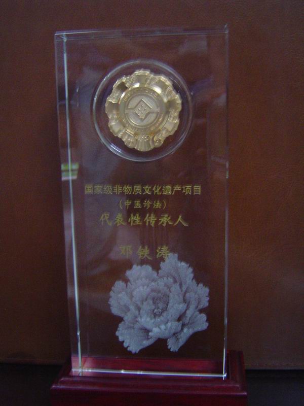 彭炜局长也对邓老入选首届"国医大师"表示祝贺,同时祝贺邓老入选国家级非物质文化遗产项目(中医诊法)代表性传承人,感谢邓老多年来对中医事业的贡献,嘱咐邓老保重身体。吴刚、彭炜一起为邓老授予国家级非物质文化遗产项目(中医诊法)代表性传承人勋章、奖座。