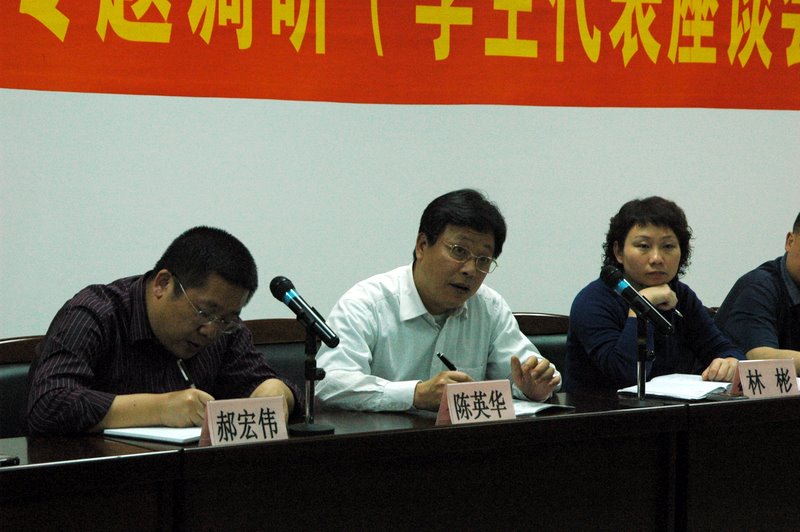 4月8日晚上,校党委副书记陈英华在团委、学生处、宣传部等部门负责人陪同下,在大学城办公楼305会议室与46位来自各院的本科生及研究生代表进行座谈。座谈会主题是"如何进一步加强校园文化建设和提高大学生综合素质"。该主题是学校领导开展的12项专题调研之一,分"学生代表座谈会"和接着将进行的"分管学生工作书记座谈会"、"相关职能部门座谈会"共三个专场座谈会。