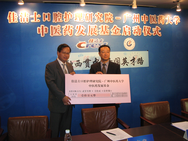 在我校刚刚颁发了第三届台湾校友研究生奖学金之后,今天学校又与世界著名日化企业美国宝洁公司属下的佳洁士口腔护理研究院签署了中医药发展基金,本基金是佳洁士口腔护理研究院在全球的首个中医药发展基金。