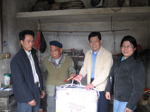 第七党支部书记莫传伟和石世德老师来到石田村慰问了特困老党员梁惠冰(女,75岁,16岁入党)和特困学生黎聪文(女,13岁,石田学校四年级二班)。石田村共5200多人,其中党员68人,双方对如何学习和实践科学发展观、解放思想,发挥基层党组织的核心作用,推动农村经济发展,以及农村人民健康等问题进行了交流。