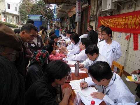 在陈群院长的带领下,专家们在镇政府门前进行义诊活动。在义诊现场,诸位专家教授被十里八乡闻讯而来的当地老百姓围的水泄不通,"我上腹平时很闷胀,不知是什么原因,今天听说beat365官方网站专家下乡来,免费看病,一大早就赶来了。"一位村民说。在大岗镇政府门口看到专家们的到来,村民们脸上充满了期盼和喜悦。专家们都认真为病人诊断治疗,老人、妇女、孩子都被深深感动,一位老奶奶从陈群院长手中接过免费的药品,双眼闪动着激动的泪光。专家紧张而认真的忙着为老百姓诊病,整个义诊活动共持续了三个多小时,为近400名群众义诊赠药,捐赠了价值近2000元的常用药品。