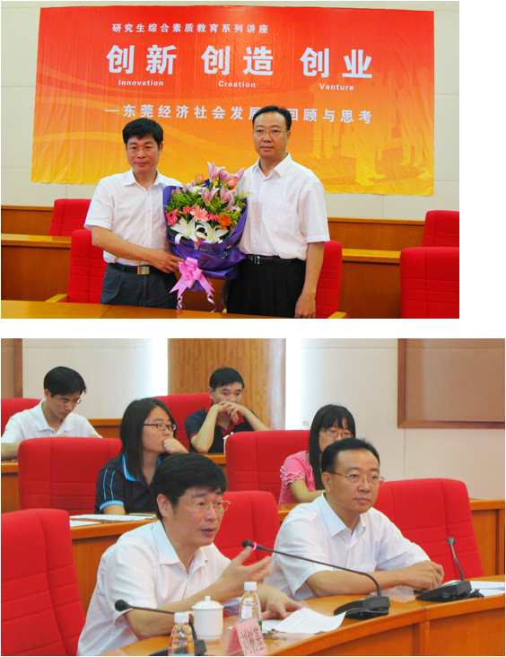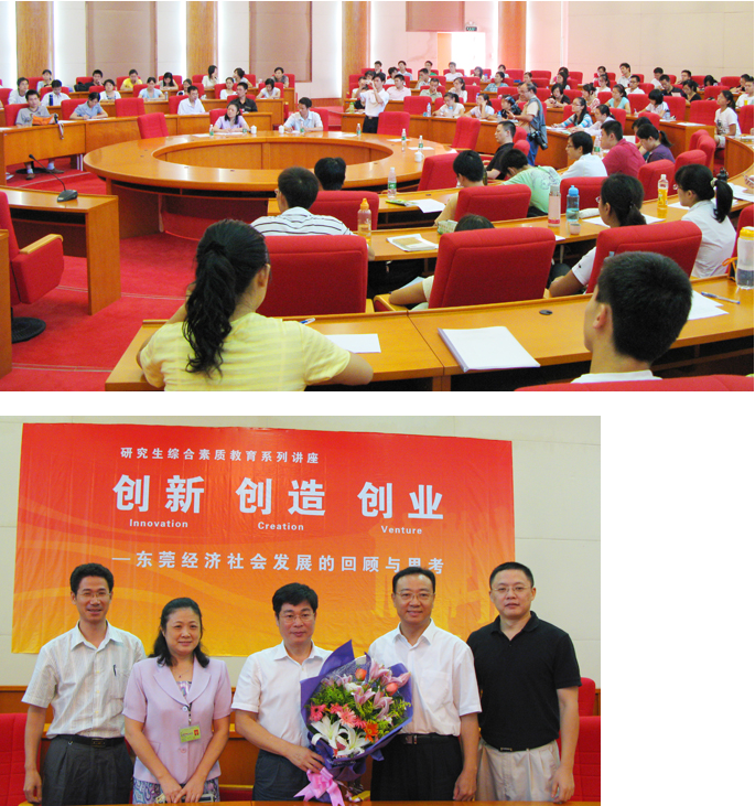 为进一步加强研究生素质教育,加深研究生对社会的认知与了解,时值我国改革开放三十年之际,应研究生院邀请,2008年10月14日下午3时,东莞市政协主席刘树基同志莅临我校指导工作,并结合东莞改革开放三十年来的成就与经验,为我校的研究生做了题为"创新、创造、创业——东莞经济社会发展的回顾与思考"的精彩演讲,在研究生中引起强烈反响。