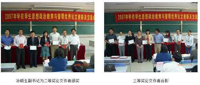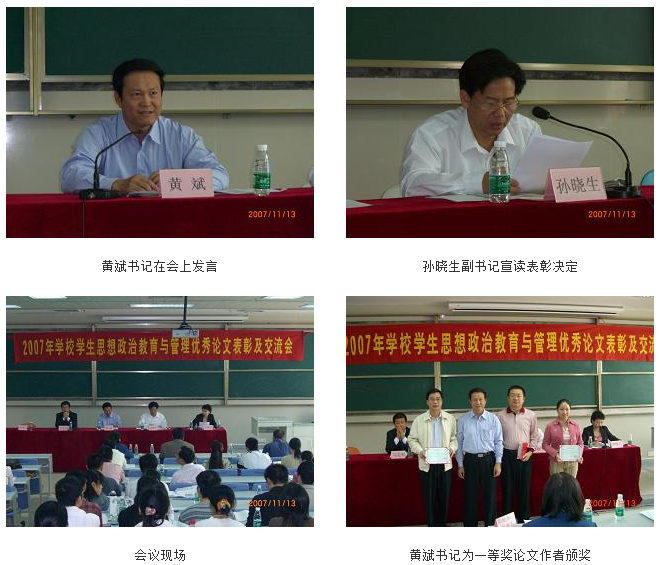 会议由学生处林彬处长主持。会议首先由学校党委孙晓生副书记宣读《关于表彰2007年beat365官方网站学生思想政治教育与管理优秀论文的决定》。本次参评论文共45篇,主要涉及大学生思想政治教育与管理的理论与应用研究,经过七位校内专家的评审,最终评出一等奖3篇,二等奖6篇,三等奖10篇。会上,各级领导分别给获奖作者颁奖并由获得一等奖的作者在会上进行了大会交流。随后由马定科校长助理代表评审专家组,对参评文章进行了细致的点评。马助理从本届参评论文的质量、论文的研究范畴以及论文的文笔功底等方面进行了点评,使论文作者清楚地了解了文章所存在的不足和撰写文章的基本要领。大会最后由党委黄斌书记和孙晓生副书记作总结讲话。黄书记在总结中强调我们思政工作者首先要提高认识,统一思想,切实把加强辅导员队伍建设这项政治任务抓实抓好;其次要立足当前,着眼长远,健全辅导员队伍建设的领导管理体制、工作机制和政策保障机制;要建立学院党政"一把手"领导责任制,把辅导员队伍建设状况作为评估考核学院工作的重要指标,作为学院领导干部业绩考核的重要内容;要健全辅导员选聘、培养、发展、管理机制,鼓励优秀辅导员攻读思想政治教育硕、博士学位,加强培训,促进辅导员骨干队伍向职业化、专家化方向发展,畅通辅导员流动渠道,既吸收优秀人才从事辅导员工作,又积极向其他岗位推荐、输送辅导员,搭建辅导员队伍发展的"立交桥";同时指出,要牢记责任,不辱使命,不断提高辅导员工作水平,以社会主义核心价值体系为根本和导向,组织和指导学生开展多种形式的思想政治教育活动;最后他希望辅导员队伍能不断提高思想政治素质、不断提高专业技能、严格遵守组织纪律、培养良好工作作风,以马克思毛泽东思想、邓小平理论、"三个代表"重要思想为指导,全面贯彻落实科学发展观,为加强和改进大学生思想政治教育,促进高等教育事业持续健康发展,为学校的建设作出新的更大贡献。孙书记的讲话中对此次参评论文的质量作出了肯定,并希望能有更多的思政工作者、行政管理者能参与到其中,真正实现大学生思想政治教育的全员参与;另外他还指出,我校思政工作者的课题研究要注意立足现实问题,减少战略层面的模糊理论研究,增强战术层面的实用应用研究,为把我校思政工作推向一个新的高度而不懈努力。