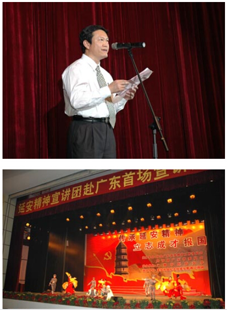 3月26日晚,由广东省委教育工作委员会、共青团广东省委联合主办的延安精神广东巡回宣讲活动在我校大礼堂拉开序幕。省委副书记刘玉浦、省人大副主任王宁生、省政协副主席陈蔚文、中山大学党委书记郑德涛、省教育厅厅长罗伟其、团省委书记邓海光同志、团省委副书记白涛及部分高校领导出席了活动。我校党委书记黄斌在致辞中强调,青年学生必须牢记历史,传承革命优良传统,进一步弘扬艰苦奋斗、理论联系实际、开拓创新和实事求是的延安精神。