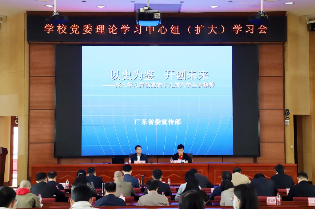 12月15日,学校党委在大学城校区办公楼201学术报告厅召开理论学习中心组(扩大)学习会,深入学习贯彻党的十九届六中全会精神。会议邀请广东省委宣传部二级巡视员冯永忠作专题宣讲。学校党委书记张建华主持,第三巡回指导组陈伟民副组长列席。