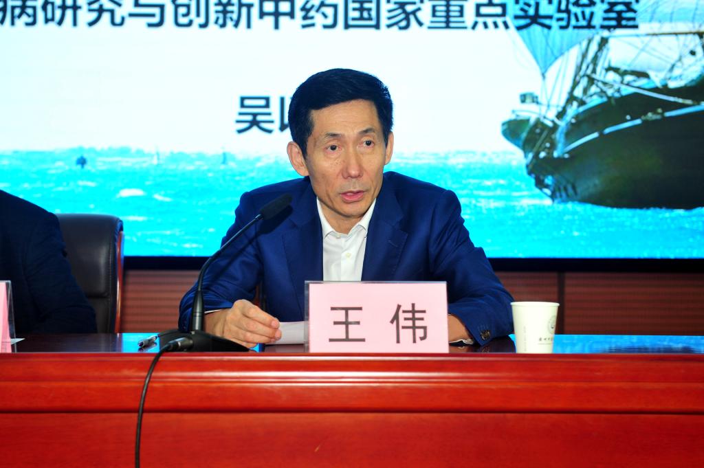 王伟校长致欢迎辞,他介绍了吴以岭院士在科技创新领域的卓越成就,特别提到吴院士是中医界理法方药系统创新的第一人,他创立的“理论—临床—新药”一体化发展模式,对推动中医药学术发展与现代化做出了重要贡献,并代表我校对吴院士的到来表示衷心的感谢。