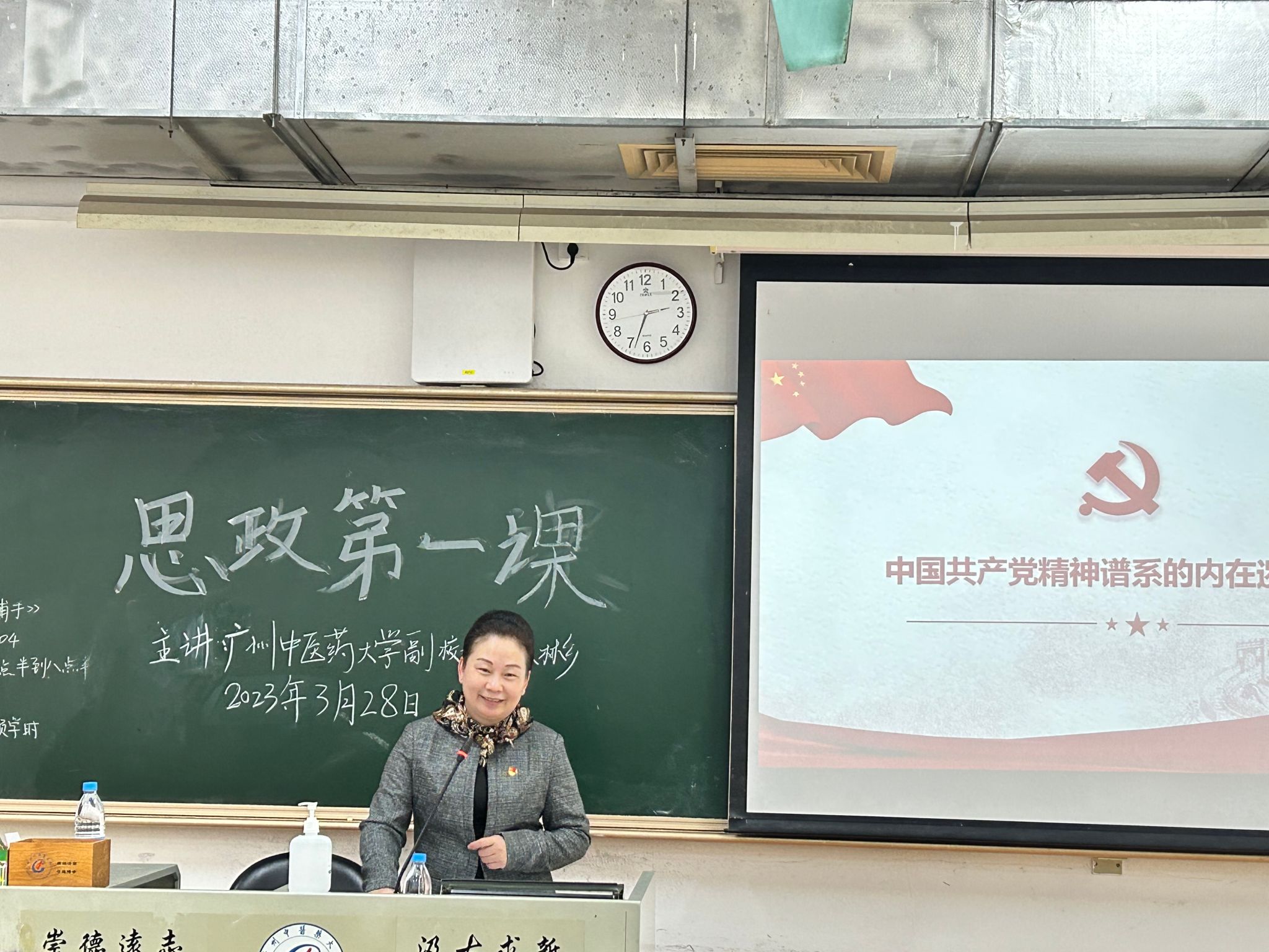 3月28日下午,副校长林彬以“弘扬中国共产党精神谱系,传承中华优秀传统文化,助力中医药事业高质量发展”为题,在大学城校区教学楼A211课室为体育健康学院2022级体育教育5班同学讲授新学期“思政第一课”。