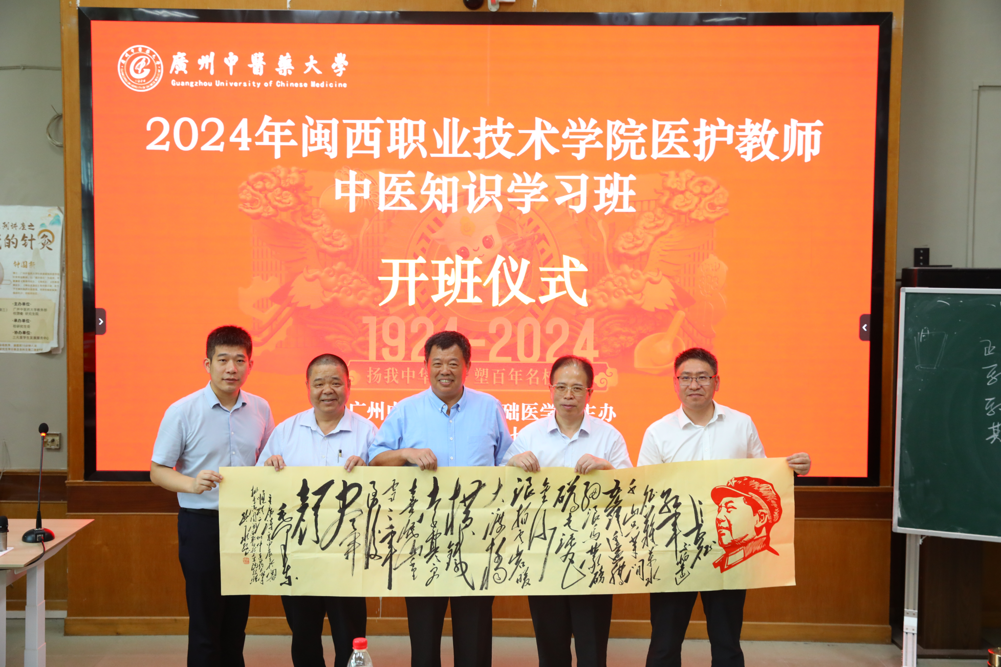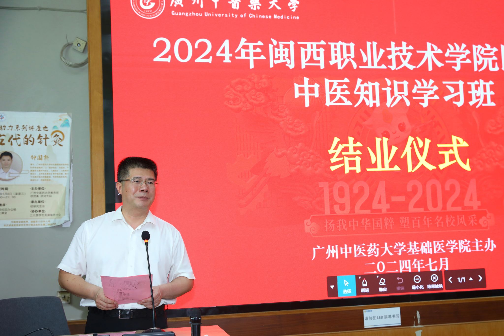 陈文锋在结业仪式上强调,本次学习班的举办是两校深化合作共谋发展,促进中医药传承创新发展的重要举措,期待两校继续完善沟通机制,就教学、科研、人才培养各方面加强联动,举办更多不同层次的中医基础理论和临床诊疗知识培训课程,继续加强资源共享,促进共同发展,务求实效的落实好各项共建内容,共同努力推动中医药教育事业高质量发展。同时寄语参训学员理论联系实际,将本次培训班所学的中医药知识运用到本职工作中,为闽西职院医护学院中医药类专业和课程建设做出更大的贡献。热情邀请闽职院各位领导、专家与校友参加广中医百年校庆活动。
