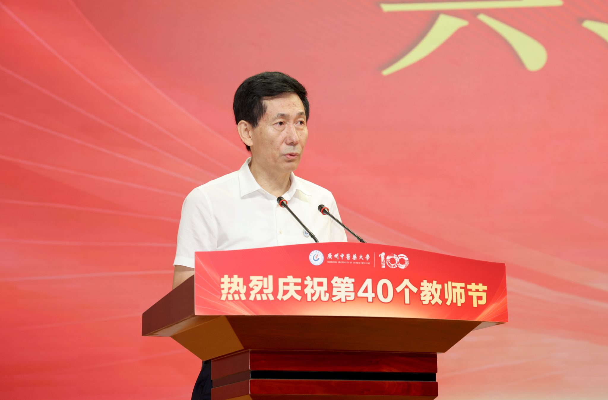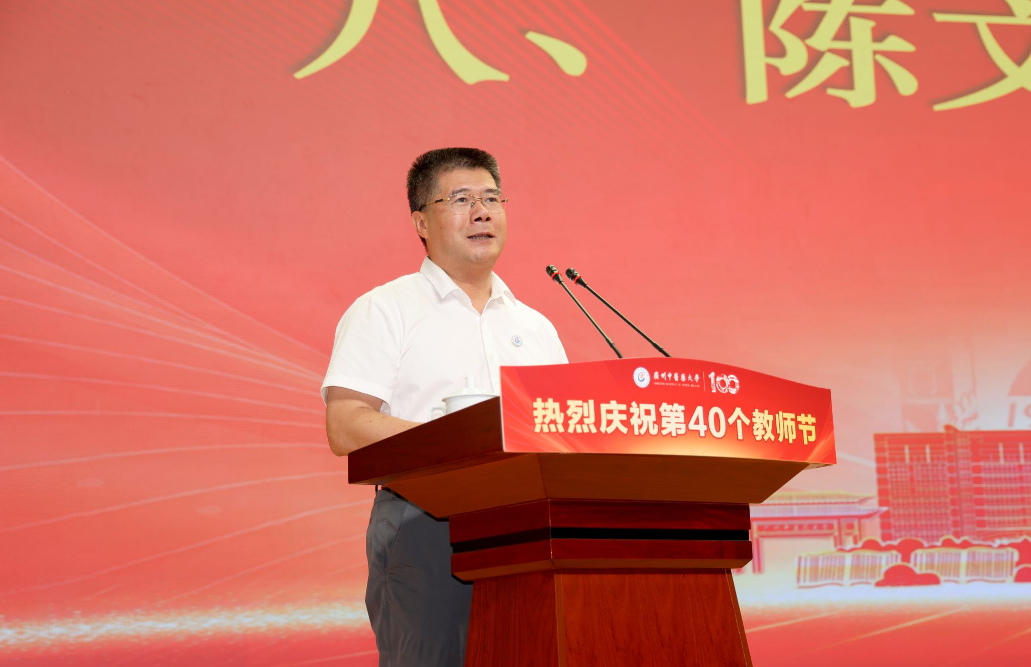 陈文锋书记代表学校党委向全校广大教师和教育工作者致以节日的问候,向获得表彰的优秀教师和教育工作者表示热烈的祝贺。今年是建校一百周年,这些年来学校改革发展的每一步都镌刻着全体教职员工砥砺奋进的身影。国医大师禤国维教授的先进事迹以及受表彰的教师和教育工作者,让我们看到了甘为人梯、淡泊名利、潜心育人的可敬风范,看到了投身科研、矢志创新、追求卓越的崇高境界,还看到了爱校敬业、任劳任怨、无私奉献的可贵品质。