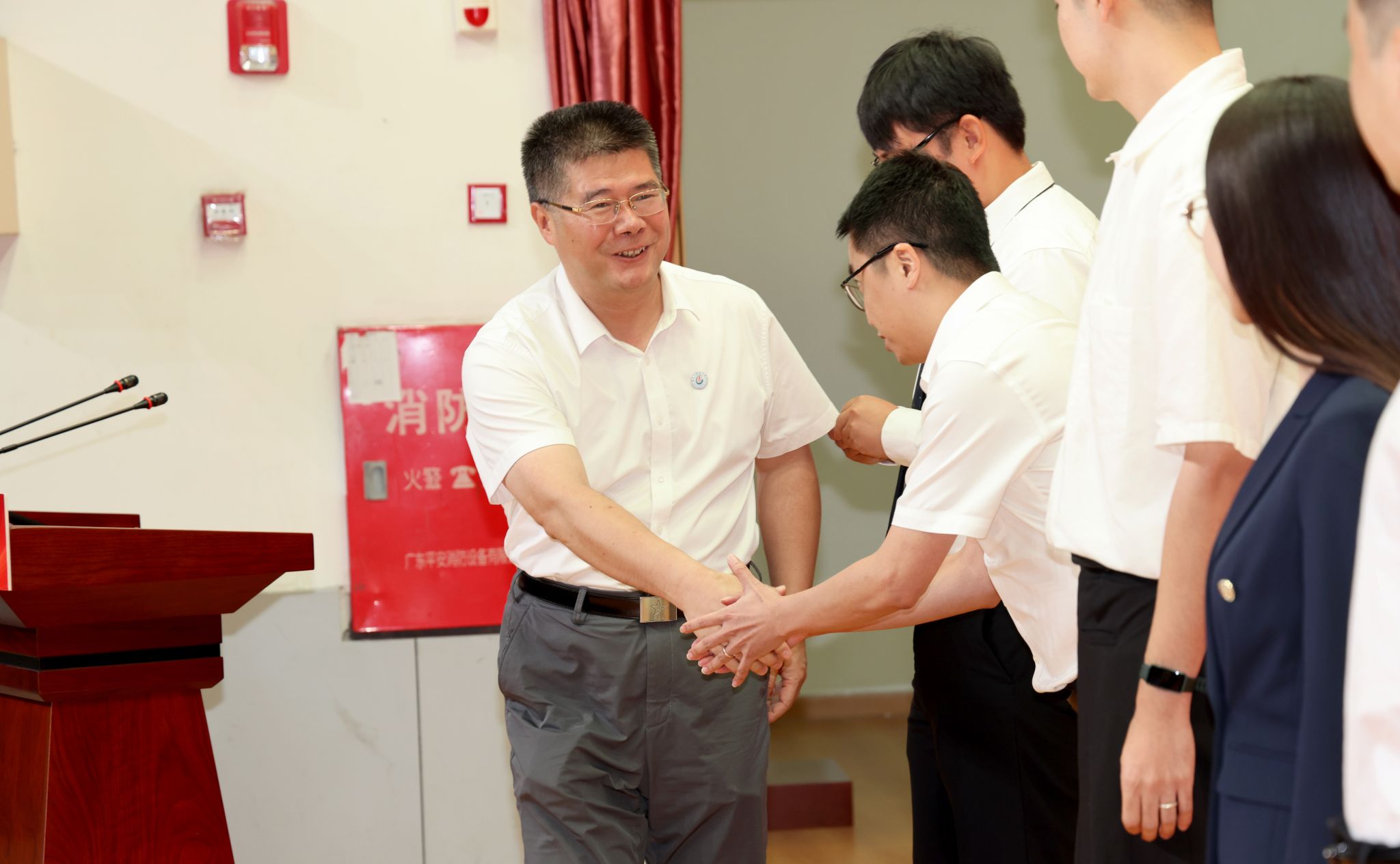 在悠扬的校歌声中,陈文锋书记、王伟校长为2024年新入职教师代表授校徽。