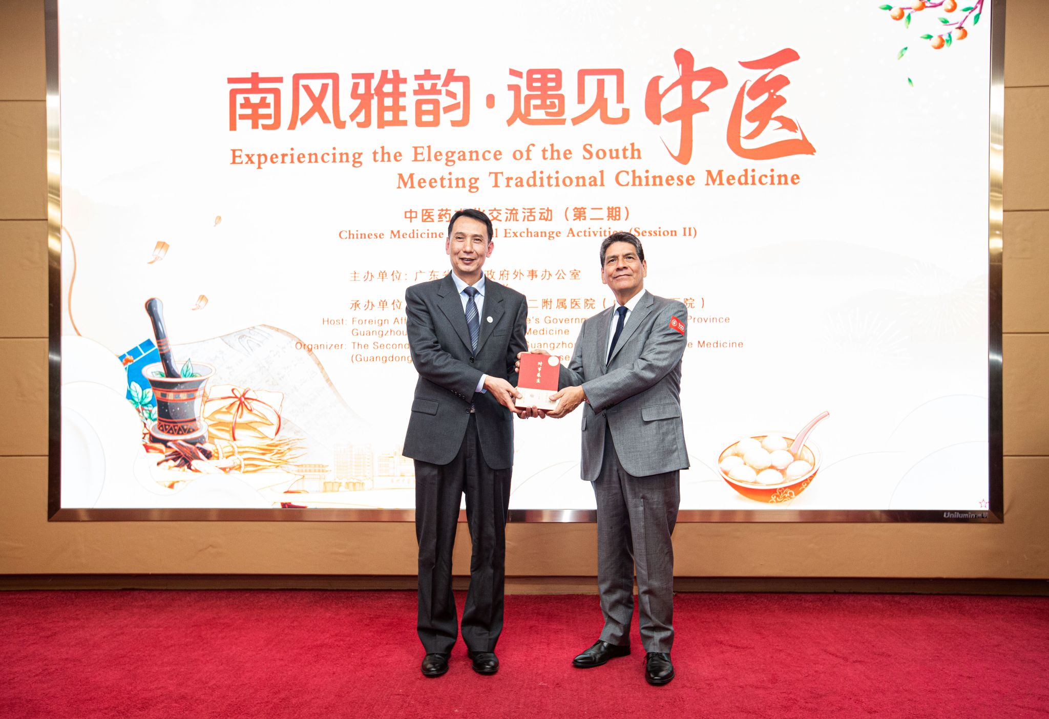 为加强中外文化交流,在中国传统节日冬至前夕,12月19日下午,“南风雅韵·遇见中医”第二期活动在第二附属医院(广东省中医院)大学城医院举办。学校党委常委、副校长郭鸿,第二附属医院(广东省中医院)党委副书记谭利斌,与来自12家外国驻穗总领馆的17位官员和家属出席活动。