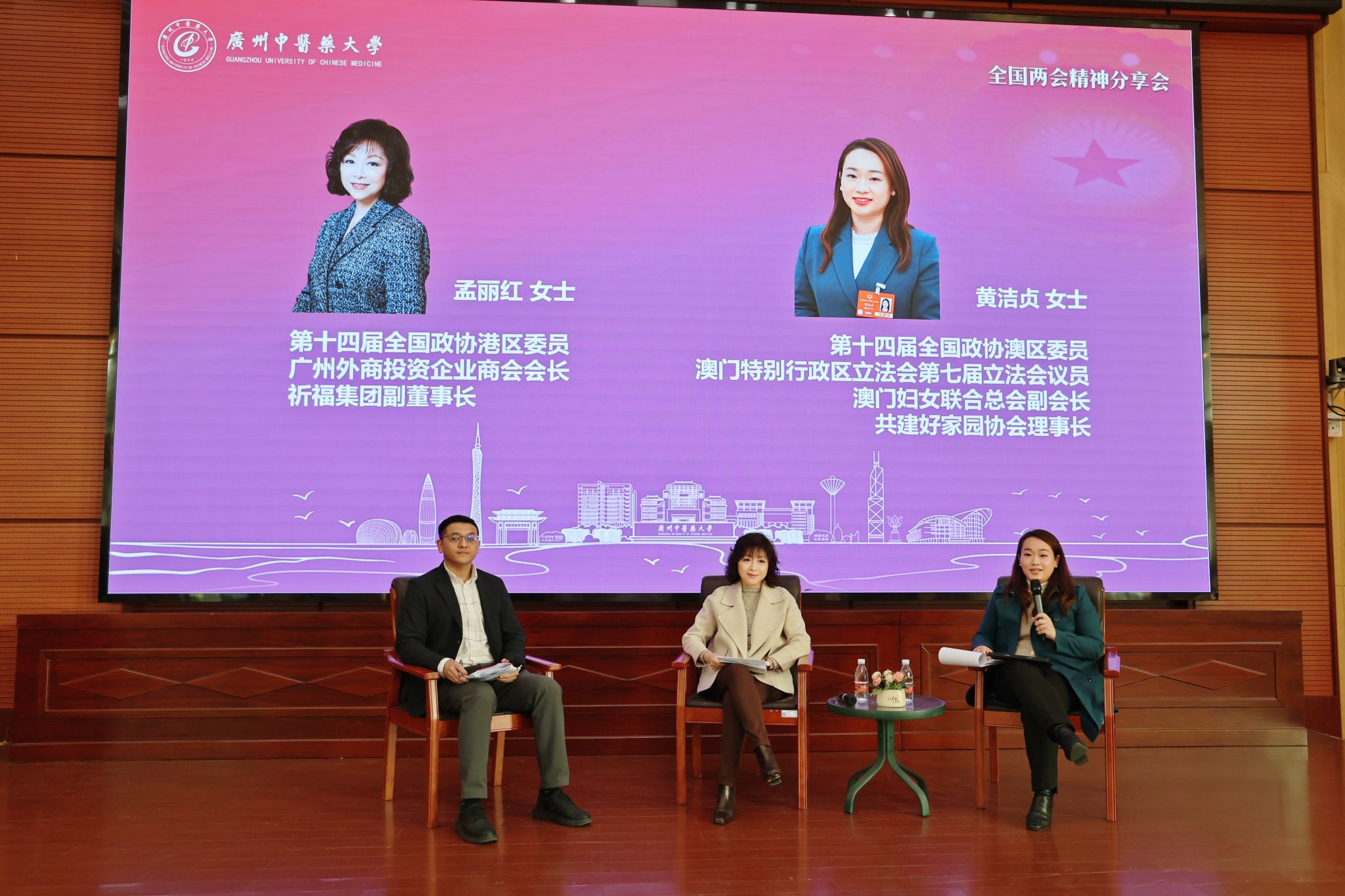 为深入学习贯彻2025年全国两会精神,引导港澳学生深刻理解国家发展战略,4月1日下午,全国两会精神分享会在beat365官方网站大学城校区举行。港区全国政协委员孟丽红、澳区全国政协委员黄洁贞作分享,我校香港、澳门学生、广东高校香港学生联合会、澳门学生联合会代表等200多人现场参与。