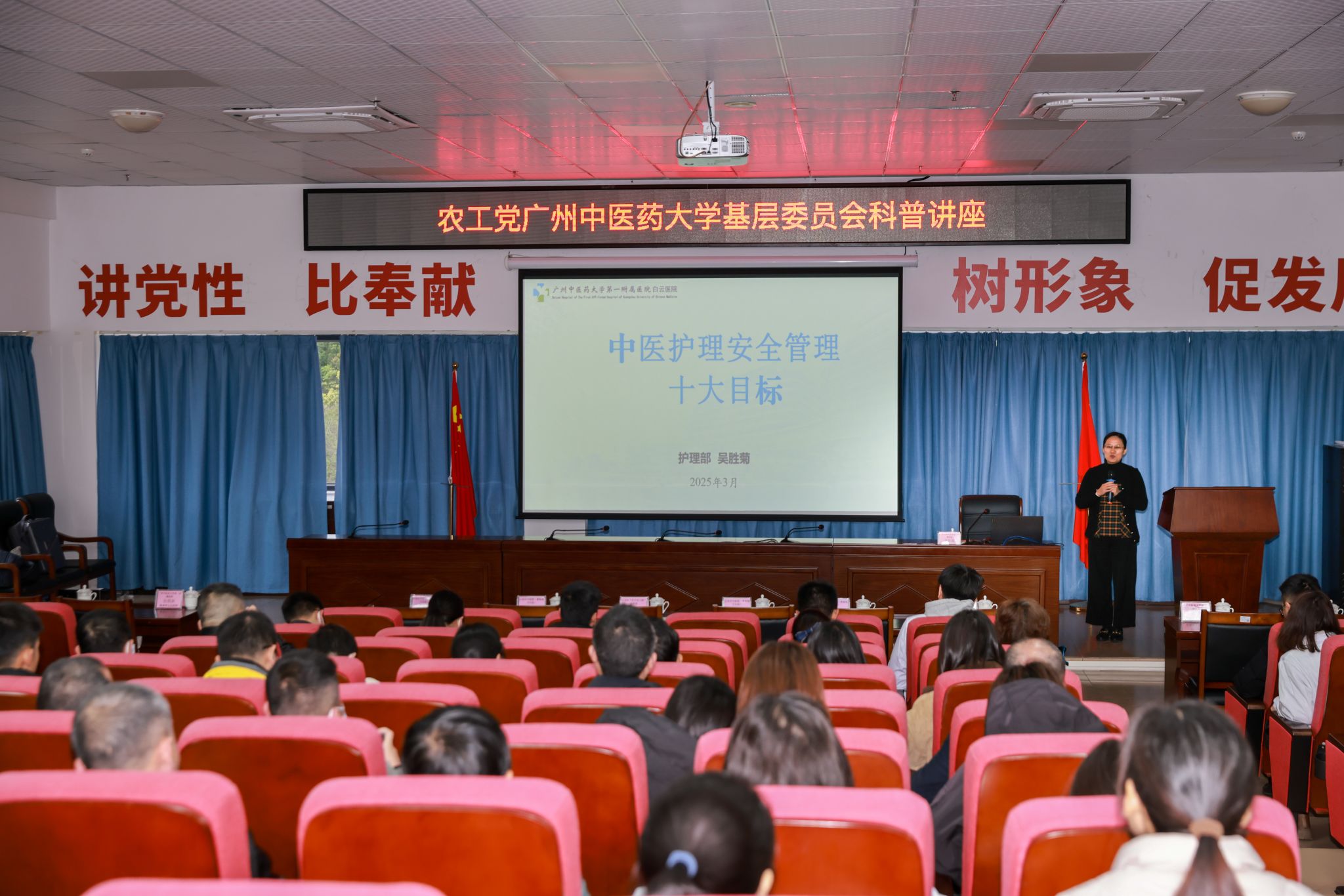 作为活动重要组成部分,两场专业培训同步开展。学校第一附属医院肾内科副主任医师涂海涛以“心肺复苏术”为主题进行现场教学,通过模拟人演示与分组实操相结合的方式,系统培训基层医务人员急救技能。第一附属医院白云医院护理部主任吴胜菊围绕“中医护理安全管理十大目标”展开专题讲座,结合临床案例解析护理安全管理规范,来自云安区各级医疗机构的140余名医务人员参与培训。培训采用理论授课与实践操作相结合的方式,有效提升基层医疗服务规范化水平。