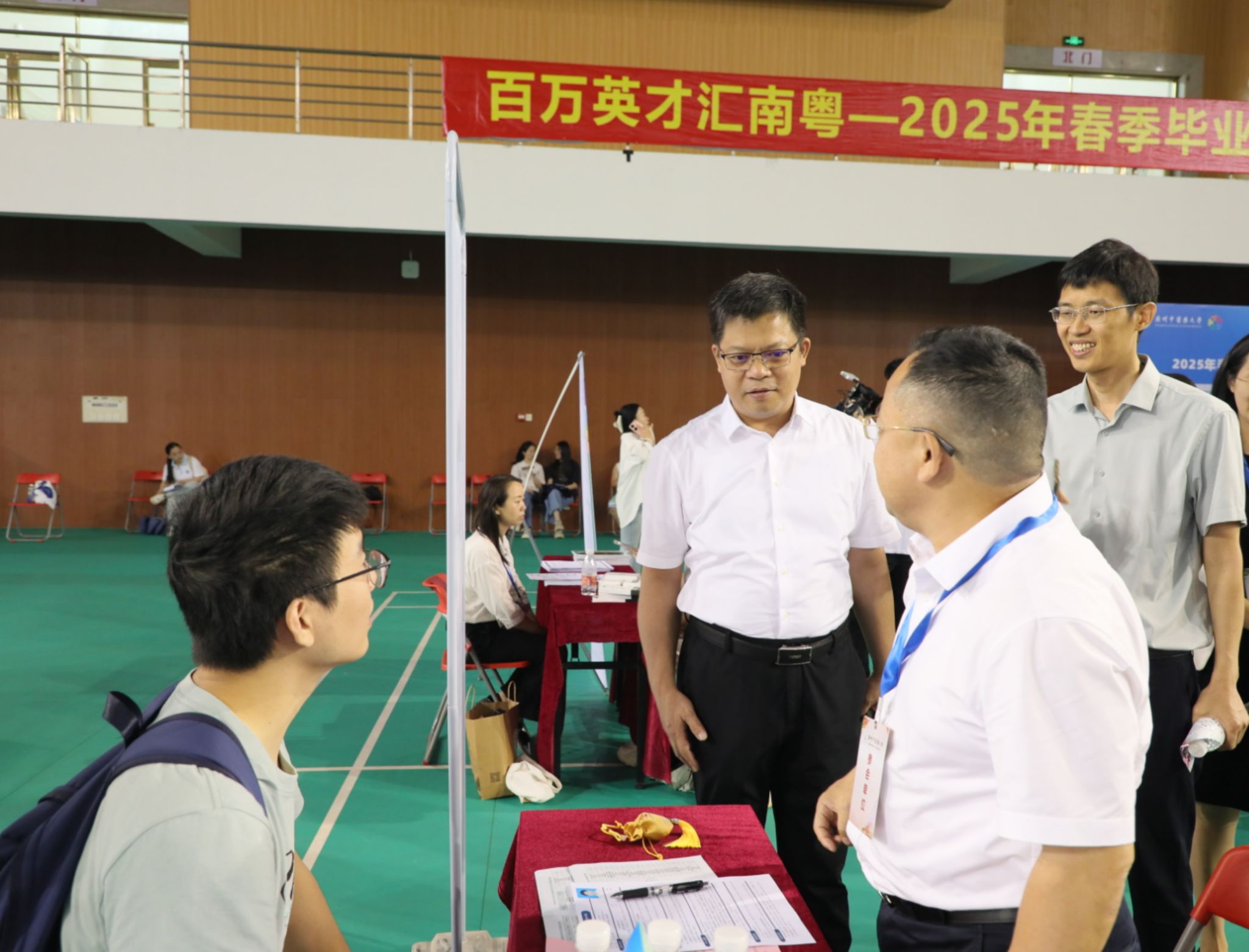 5月8日,“百万英才汇南粤”2025年春季毕业生供需对接活动beat365官方网站专场在大学城校区体育馆举行,吸引58家用人单位携3075个岗位前来参加。学校党委副书记邱亚洪、副校长刘中秋莅临现场指导工作。他们与用人单位热情交流,了解用人单位需求和对学校人才培养的建议,鼓励毕业生把握机遇,积极主动求职,到祖国需要的地方去。