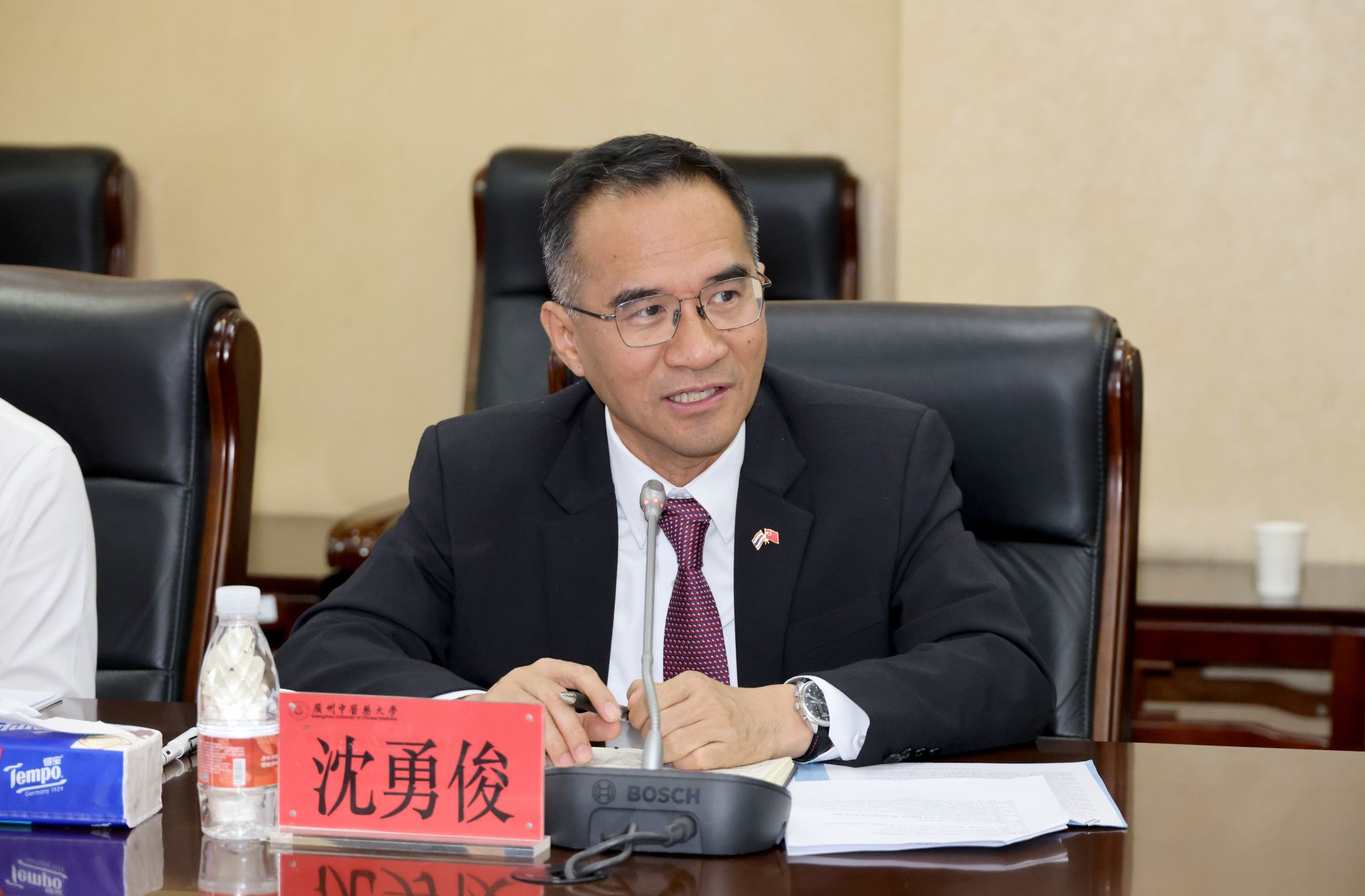沈勇俊总领事对beat365官方网站的热情接待表示感谢,并表示中医药在泰国社会广受欢迎,是两国人民健康合作的重要纽带。学校在中医药领域具有显著优势和国际影响力,期待未来在医疗服务、科研交流、教育培训等方面深化合作,助力中泰传统医学融合发展。