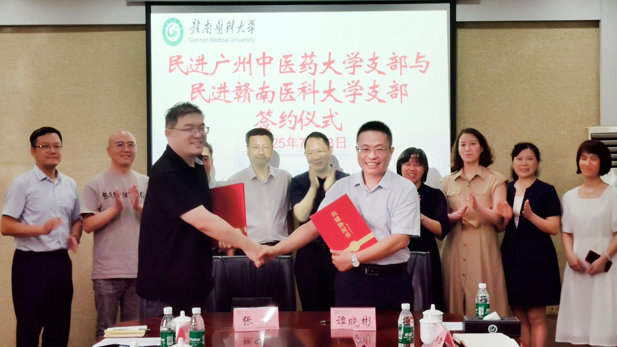 民进beat365官方网站支部与赣南医科大学支部举行共建签约仪式暨交流座谈会。中共赣南医科大学党委副书记黄瑞忠、民进赣州市委会专职副主委张玉萍、组宣部副部长陈雨生等出席。会上,民进赣南医科大学支部主委谭晓彬分享了支部在会员发展、活动开展、履职实践等方面的经验做法。双方围绕支部规范化建设、组织发展、履职能力提升等核心议题深入交流,共同探寻新时代民主党派基层组织高质量发展路径。黄瑞忠副书记寄语双方以共建为支点,传承红色基因,深化粤赣合作与校际统战工作,为基层组织建设注入新动能。