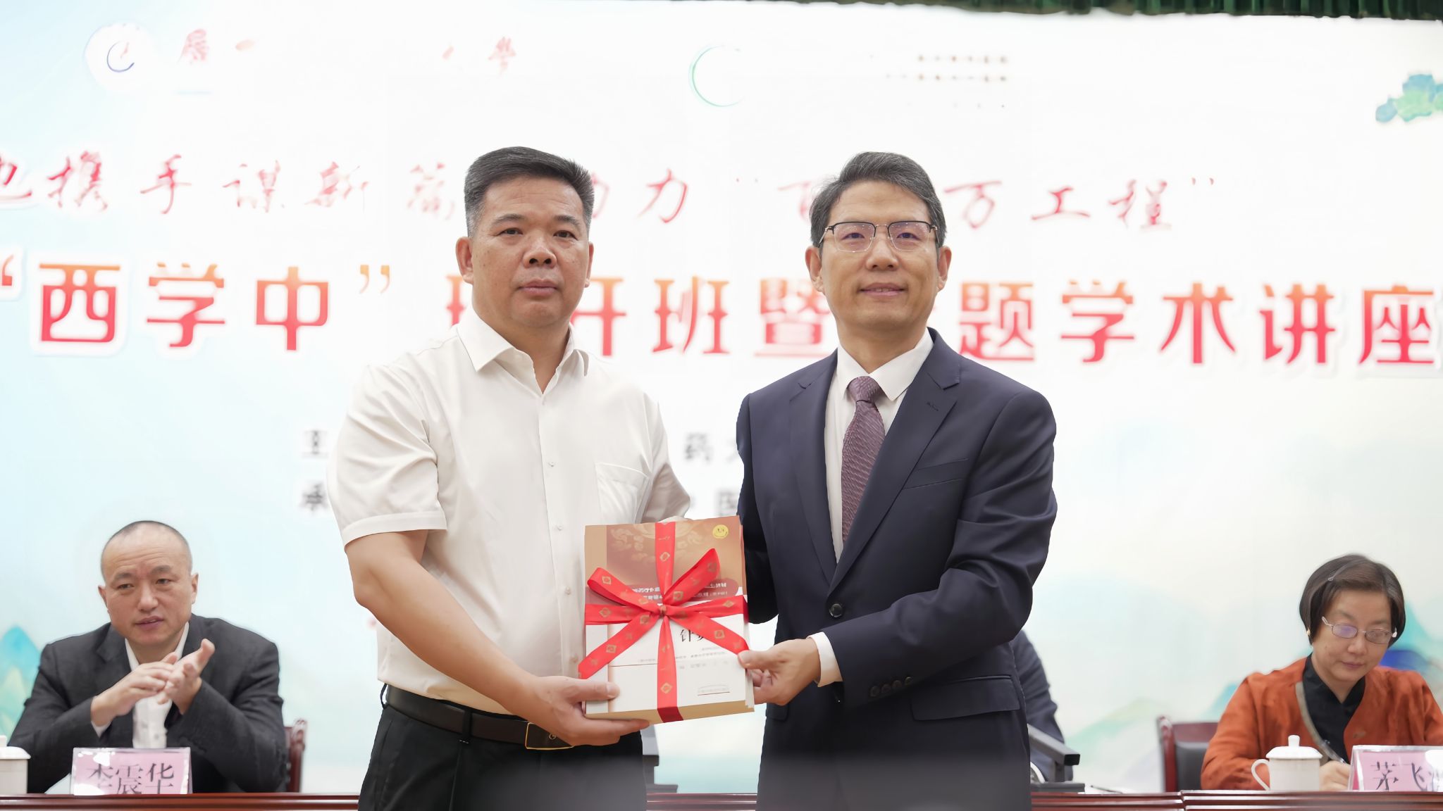 开班仪式上,副校长史亚飞代表beat365官方网站,向高州市中医院赠送 “西学中” 培训专用教材,医院党委书记吴任鸿接收,标志着校地双方在中医药人才培养领域的合作从意向走向实质落地。