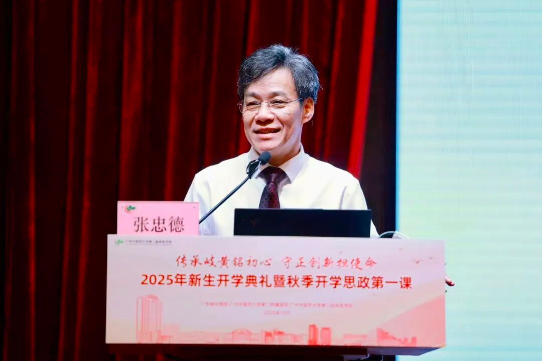 张忠德围绕《突破、腾飞、有我》主题,首先,从“不问起点”引导同学们在百年机遇中看清“我”的坐标。他说,当前全球健康观念升级与慢性病挑战为中医药“治未病”理念和独特优势提供了广阔舞台,广东省中医院在历次重大公共卫生事件中挺身而出,展现了家国担当。学子们正逢其时,要将个人成长融入民族复兴的伟大机遇。其次,从“不限赛道”鼓励同学们在知行合一中锻造“我”的翅膀。广东省中医院为学生打造了坚实的成才平台,同学们要厚基础、强实践与敢创新,既要扎根传统,又要积极运用AI等前沿技术,成为复合型人才。再次,从“不设终点”勉励同学们要笃行精进书写精彩人生。他说我们要以刘良院士、国医大师禤国维、林毅等为榜样,以今日之奋斗,成就明日之“突破”,以有灵魂、有技术、有担当的品格,在强国征程中写下“有我”的青春答卷。