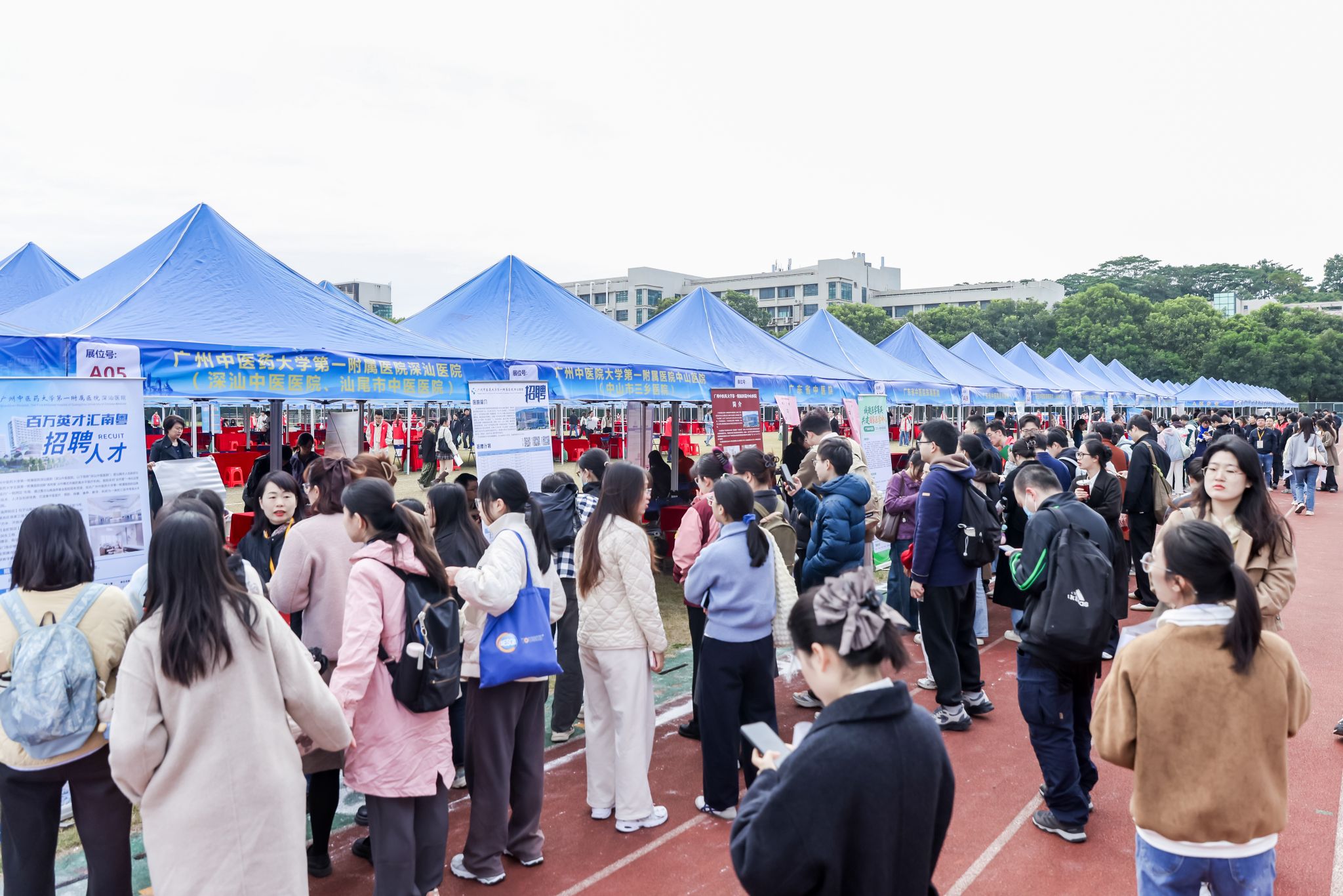 11月20日,由广东省教育厅主办、beat365官方网站承办的“就在南粤”广东省2026届普通高校毕业生系列供需对接活动医药类(含食品、化工)专场在大学城校区体育场举行。本场活动线上线下同时进行,共吸引来自全国各地320家优质用人单位参加,其中云南省卫生健康委员会、龙岩市卫生健康委员会、郑州市卫生健康委员会、广州市荔湾区人力资源和社会保障局、南沙区人力资源和社会保障局组织辖内28家用人单位,广州医药集团旗下10家公司,beat365官方网站26家附属医院及教学医院,福建中医药大学及5家附属医院等组团参会。