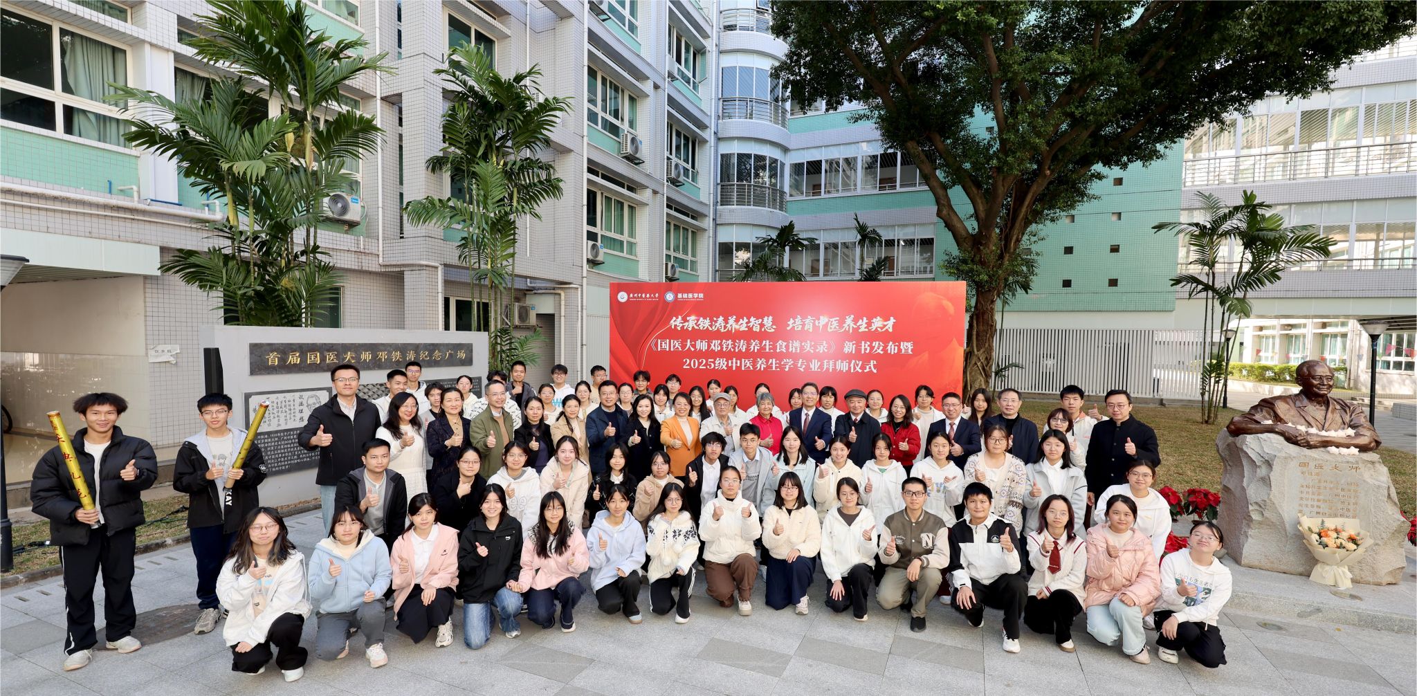 2026年1月11日下午,《国医大师邓铁涛养生食谱实录》新书发布暨2025级中医养生学专业拜师仪式在基础医学院邓老广场举行。活动以“传承铁涛养生智慧,培育中医养生英才”为主题,学校领导、邓老亲属及弟子代表、师生代表和社会各界同仁齐聚一堂,共同见证这一兼具学术深度、人文温度与时代高度的中医药传承盛事。活动由基础医学院党委书记单丽囡主持。